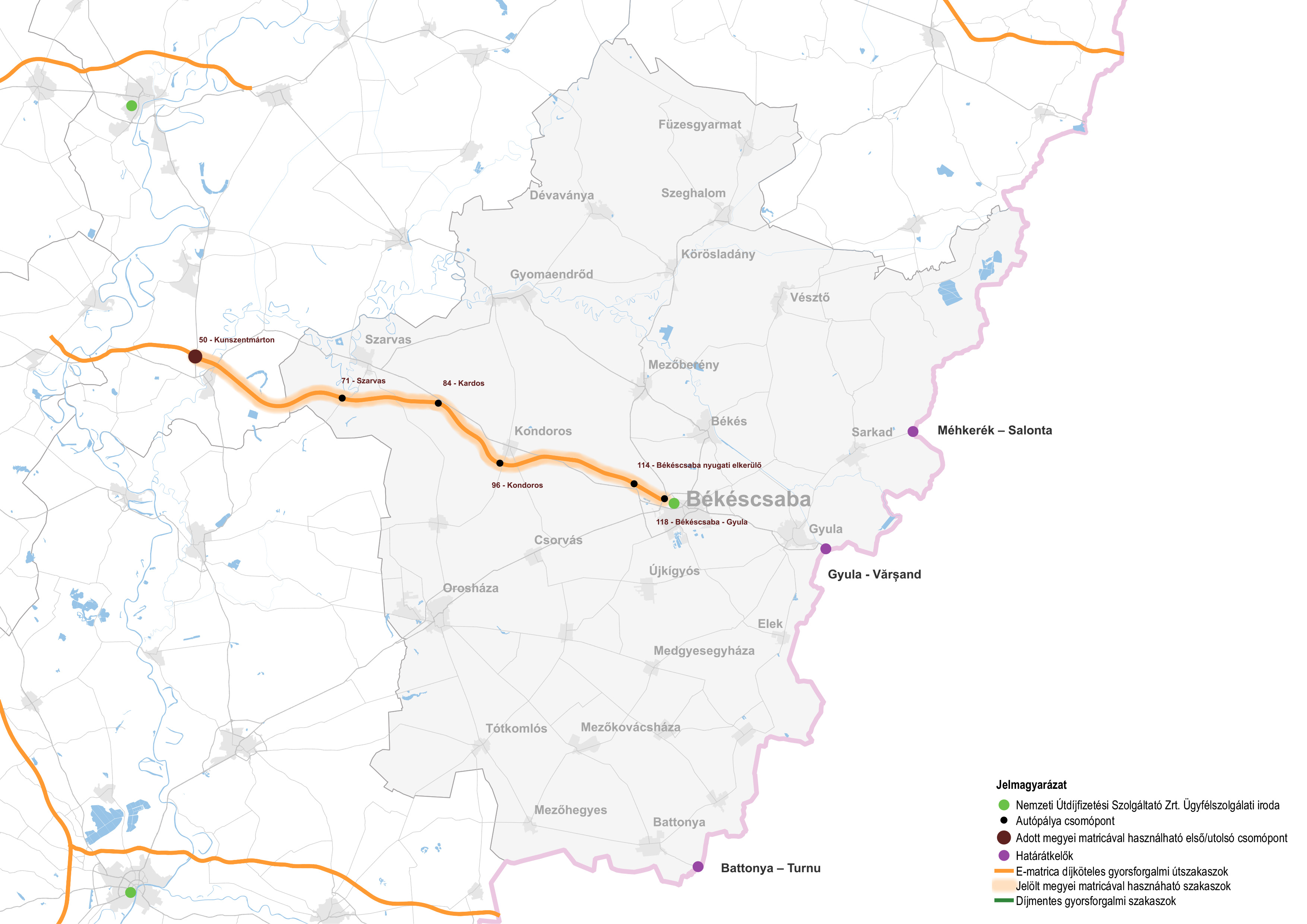 - az M44-es Szolnok/Martfű/Kunszentmárton csomóponttól Békéscsaba-Gyula/Debrecen-Szeged csomópontig